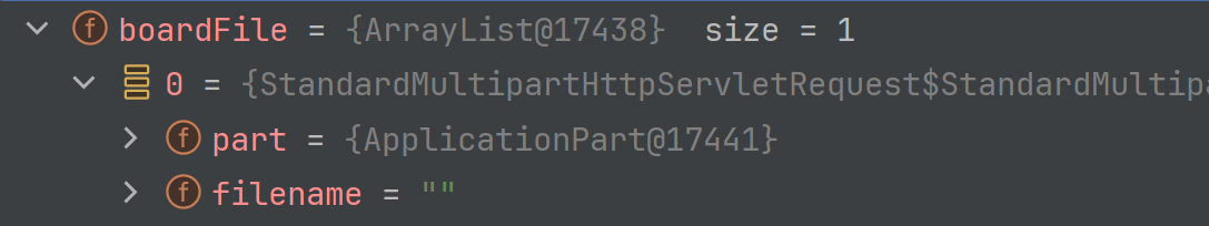 디버깅을 통해 boardFile에 접근해 보았더니 리스트가 비어있지 않았다! filename이 비어있지만 이건 정확히는 boardFile.get(0)이 비어있는 것이다.